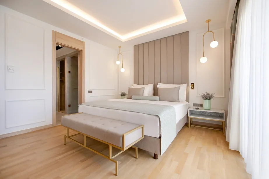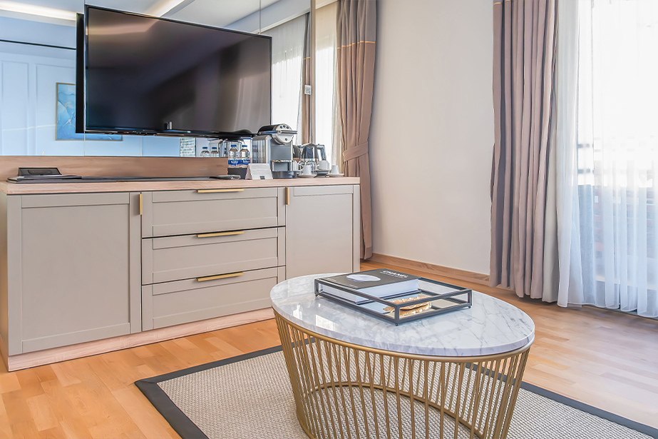 Süit oda, geniş yaşam alanları ile nefes kesici deniz ve kara manzarasıyla konforlu ve ferah bir konaklama sağlar.