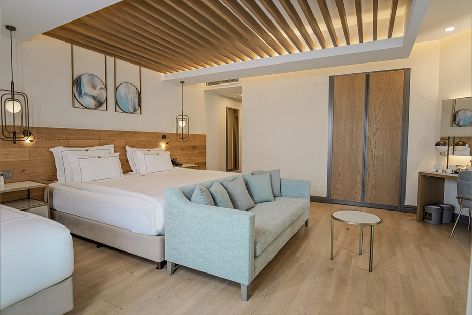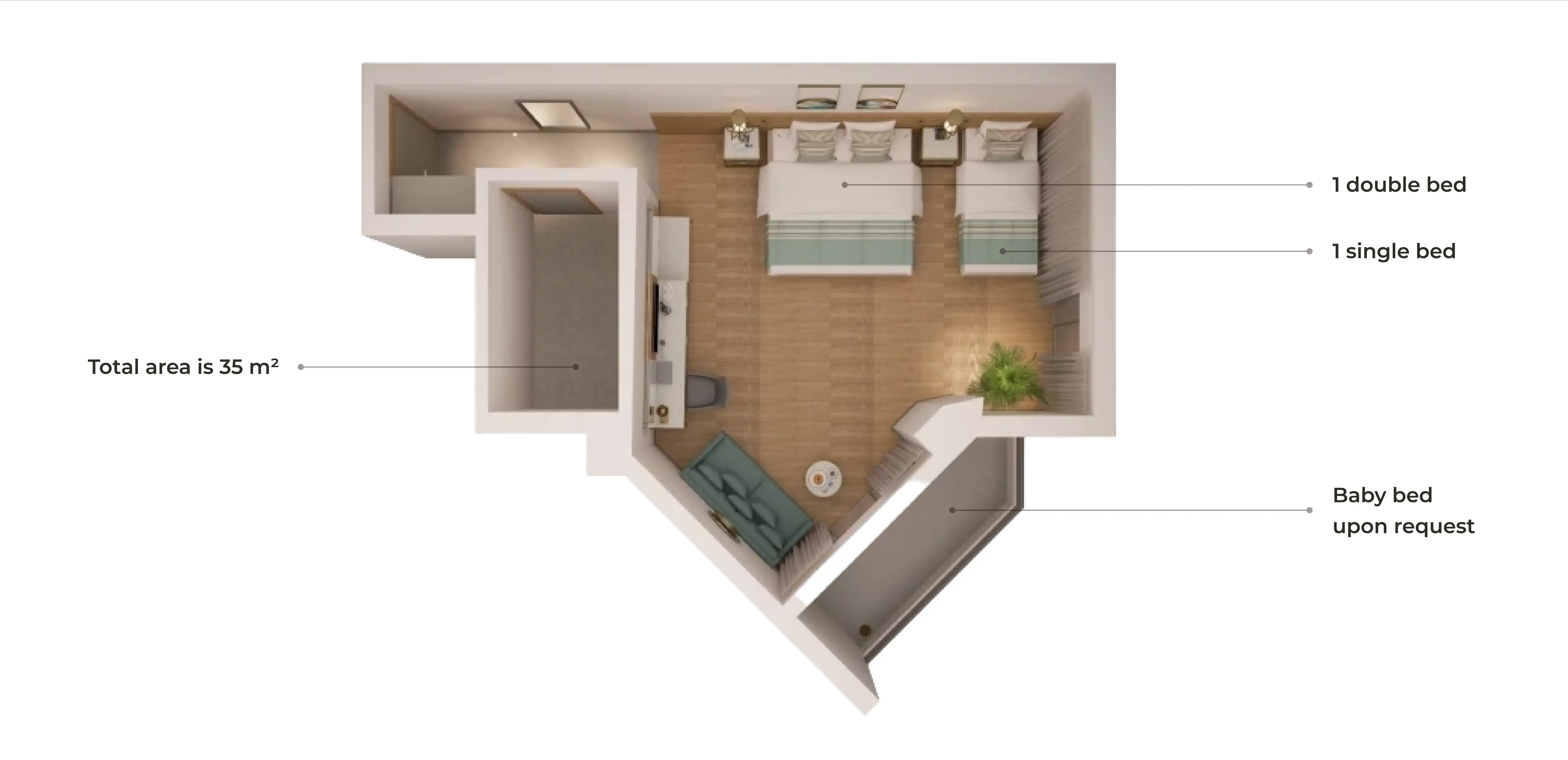 Superior Corner Room, accommodating up to 4 people, will give you an unforgettable vacation surrounded by stylish and minimalistic decor elements.