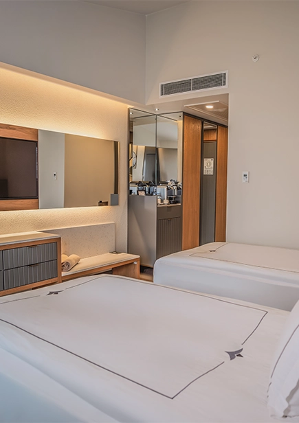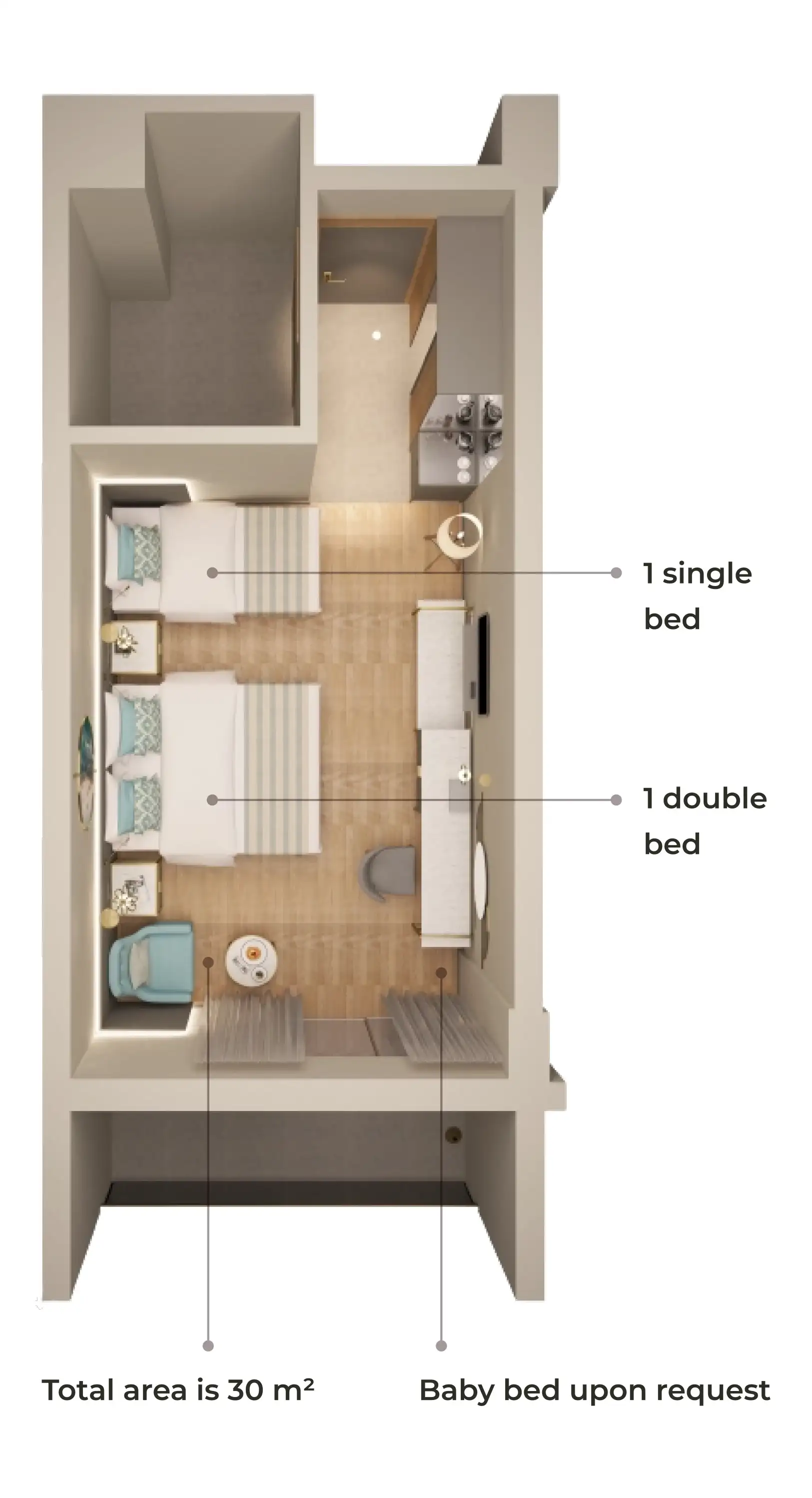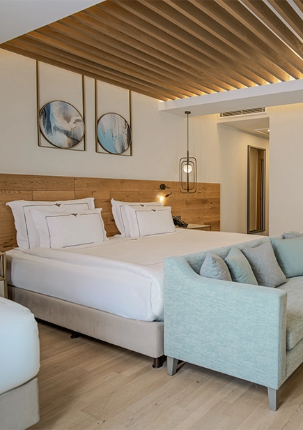 The Superior Corner rooms, with both land and side sea views, are thoughtfully equipped to ensure a more comfortable stay for our guests.