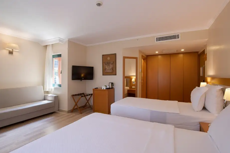 The spacious, bright family rooms are elegantly decorated in light beige soothing tones, high-quality finishes and beautiful views of the hotel garden or the city.